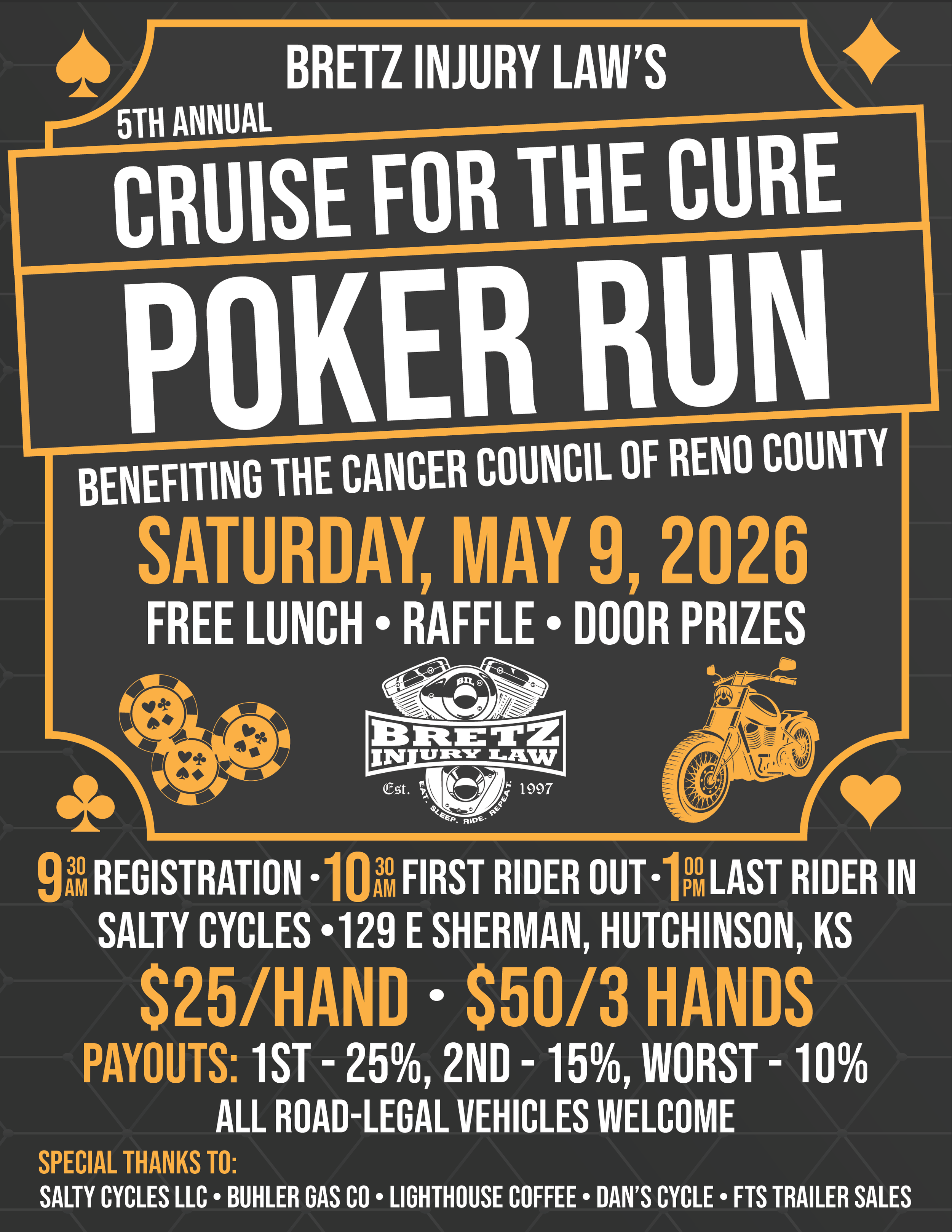 Join us on Saturday, May 9th, for the 5th Annual Cruise for the Cure Poker Run! Registration starts at 9:30 AM at Salty Cycles, 129 E. Sherman in Hutchinson, and riders will head out at 10:30 AM. Route stops will be announced soon, so follow the Facebook event page to stay up to date on the latest event details.